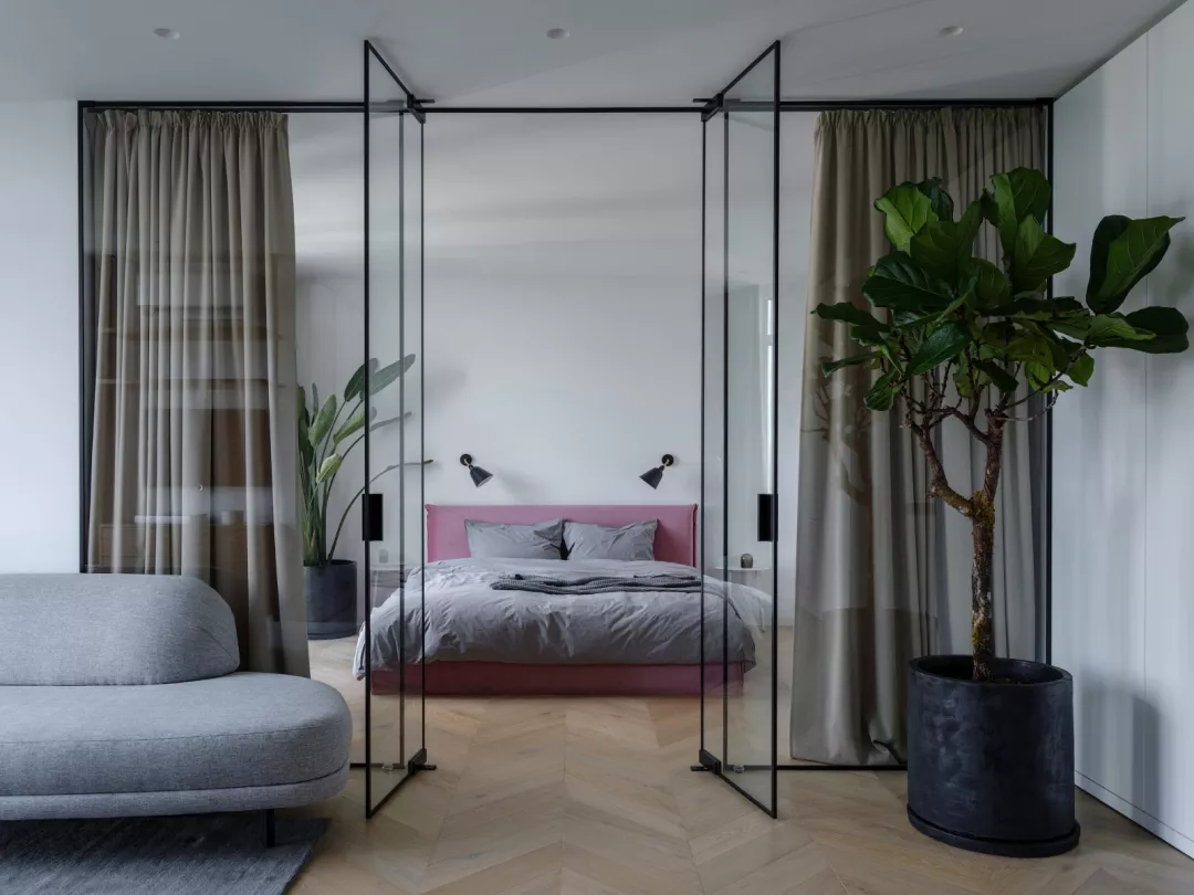 看看《小欢喜》里面宋倩的卧室,就是把整面墙都砸了,换成玻璃门,这样的话就可以更大面积的促进采光共享,而在晚上睡觉的时候又可以拉上窗帘增加空间的私密性。